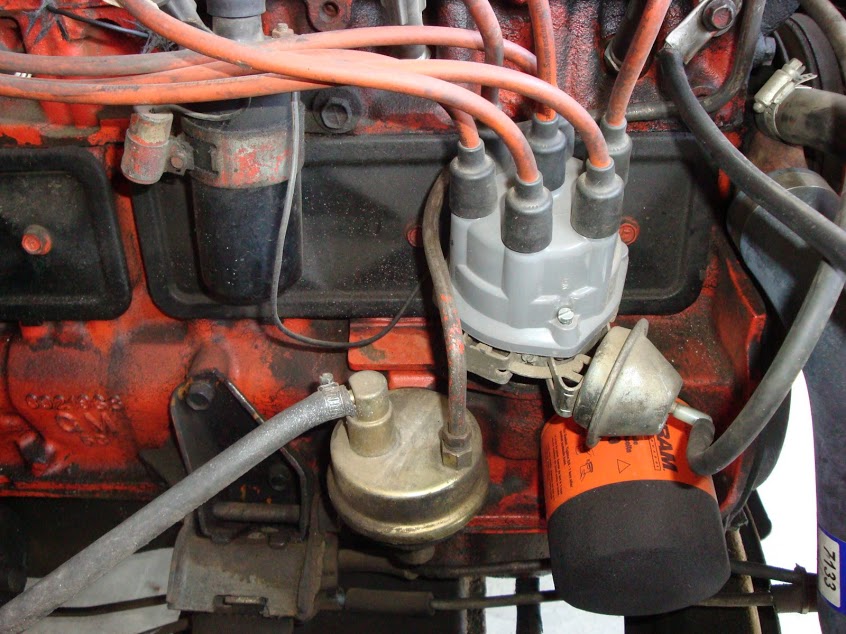 The distributor has seen some “advances” over the years. The stock distributor ran a points system and in it’s day, worked very well. In 1974 GM introduced the High Energy Ignition (HEI) distributor. The HEI distributor does exactly the same thing as the stock distributor but the separate coil is in the distributor cap and a control module with magnetic pickup replace the points. The HEI is a more reliable and more powerful distributor that requires less maintenance. Sure, the points distributor was smaller and technically factory “right” for this motor, but it’s too much of a loss over the HEI gains.