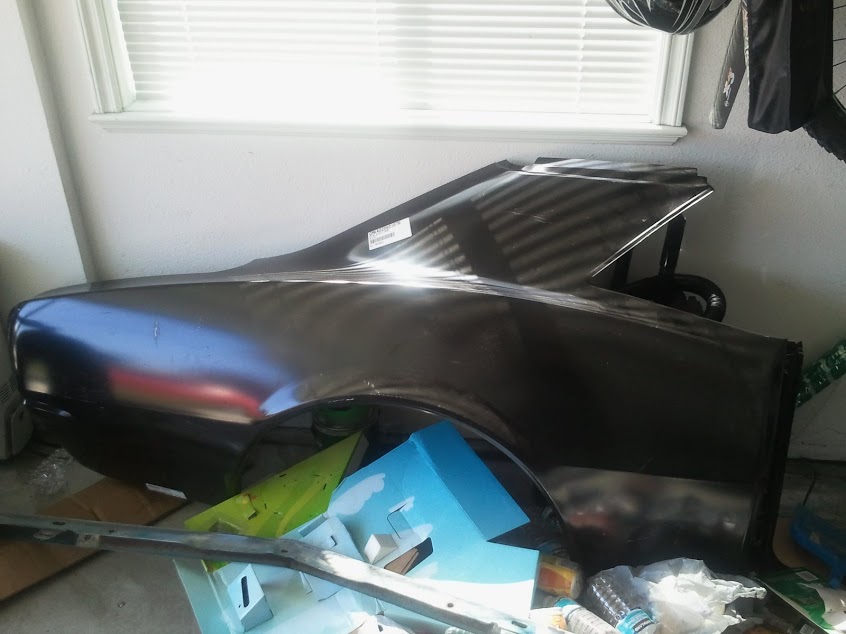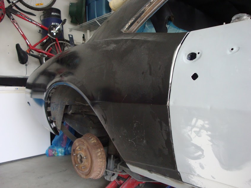 Even at the time of purchase, it was known the passenger side rear quarter panel had damage. It wasn’t until the car was sanded to bare metal that we realized the previous owner had spliced a used panel onto the damaged original, burying the mess under an inch of Bondo. The entire panel was compromised. We sourced a new replacement panel for approximately $250US.